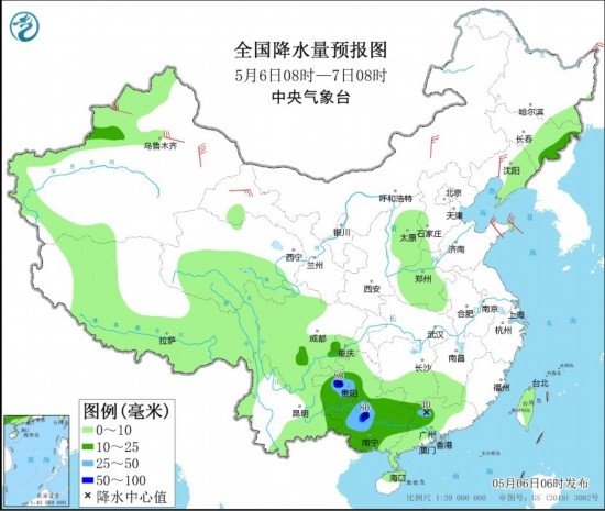 全國(guó)降水量預(yù)報(bào)圖(5月6日08時(shí)-7日08時(shí))