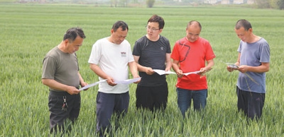 蘇丹(中)在指導(dǎo)村民進(jìn)行小麥揚(yáng)花期田間管理。本報記者 原韜雄攝