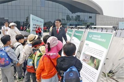 玉環(huán)法院綜合審判庭干警在漩門灣國(guó)家濕地公園,向小學(xué)生講解普法展板。