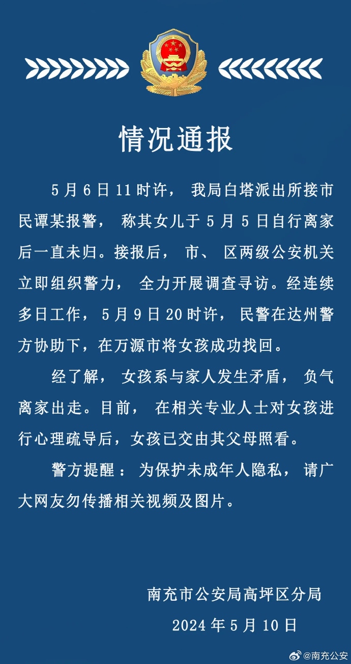 央視網(wǎng)消息:據(jù)@南充公安 微博通報(bào),5月6日11時(shí)許,南充市公安局高坪區(qū)分局白塔派出所接市民譚某報(bào)警,稱其女兒于5月5日自行離家后一直未歸。接報(bào)后,市、區(qū)兩級(jí)公安機(jī)關(guān)立即組織警力,全力開(kāi)展調(diào)査尋訪。經(jīng)連續(xù)多日工作,5月9日20時(shí)許,民警在達(dá)州警方協(xié)助下,在萬(wàn)源市將女孩成功找回。經(jīng)了解,女孩系與家人發(fā)生矛盾,負(fù)氣離家出走。目前,在相關(guān)專業(yè)人士對(duì)女孩進(jìn)行心理疏導(dǎo)后,女孩已交由其父母照看。