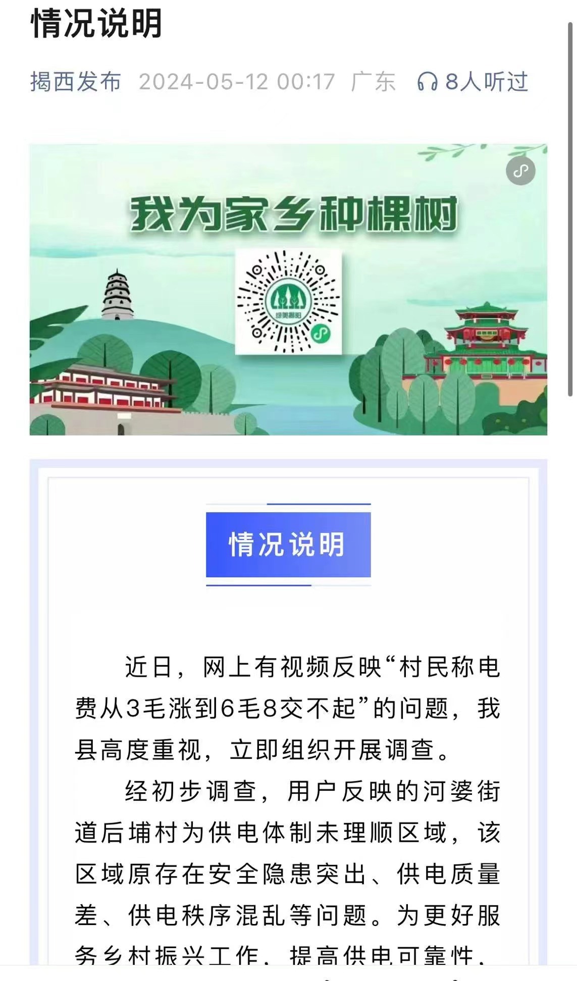 針對此事,“揭西發(fā)布”微信公眾號于5月12日發(fā)布了情況說明,表示對網(wǎng)上反映的“村民稱電費從3毛漲到6毛8交不起”的問題高度重視,并已立即開展調(diào)查。