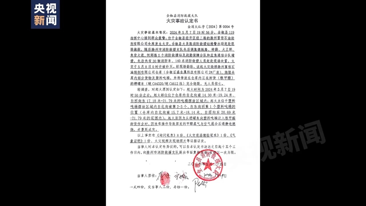 記者從全椒縣消防救援大隊于5月24日出具的火災事故認定書上發(fā)現,5月7日晚上7點多,滁州富信助劑有限公司倉庫發(fā)生火災,滁州市消防救援支隊調集30輛消防車、140名消防救援人員現場處置,火災于5月8日0時許撲滅。經現場勘驗,該起火災燒損滁州富信石油助劑有限公司倉庫、燒毀倉庫內部分貨物及塑料噸桶,并將停放在倉庫內正在卸粗甲醇的槽罐車完全燒毀,無人員傷亡。