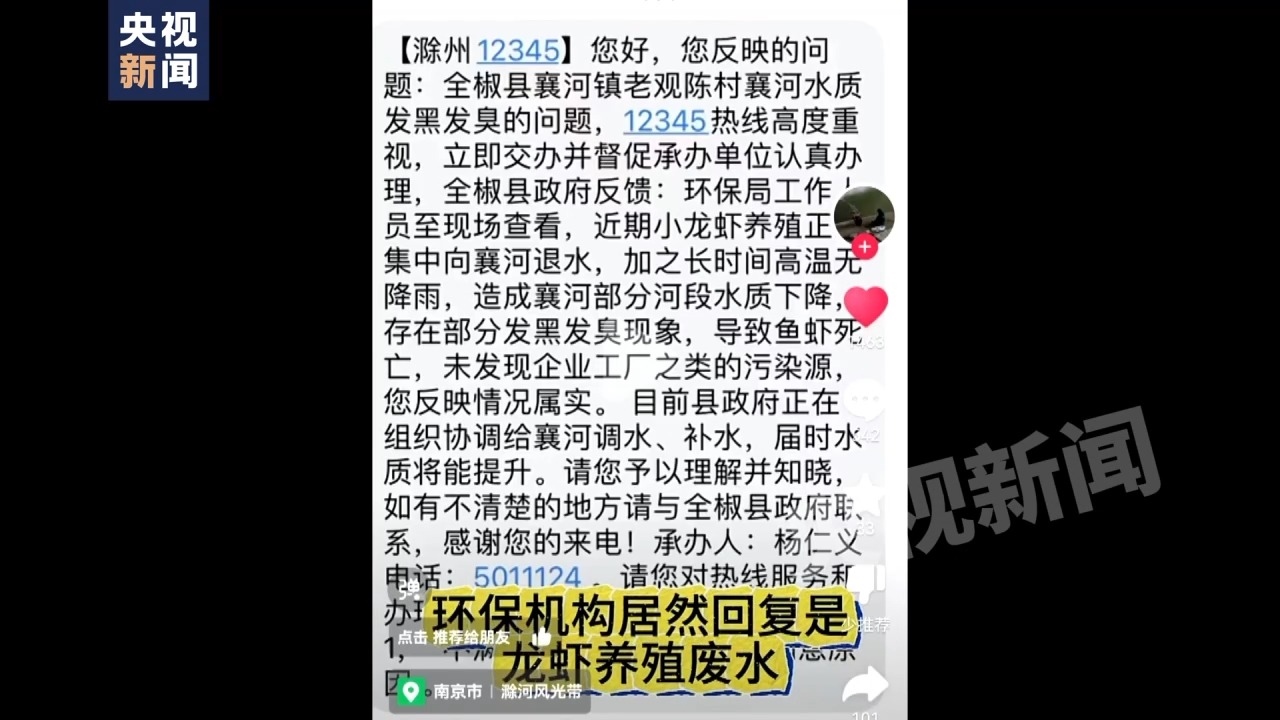 記者:但是我看到了有一個滁州12345,關于全椒縣襄河鎮(zhèn)老觀陳村襄河水質發(fā)黑發(fā)臭問題的回復,留的承辦人叫楊仁義。
