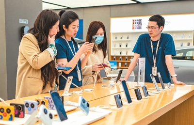 圖為上海華為一家線下門店內(nèi),消費者在體驗華為Pura70系列手機。王 初攝(人民視覺)