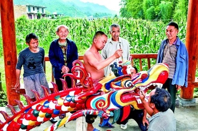 眾人抬著一艘近百米長的特制龍舟前往河邊。