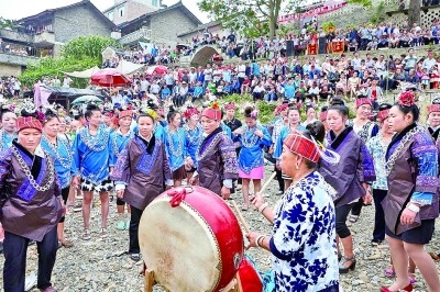 龍舟節(jié)上,人們跟著鼓聲跳起蘆笙舞。