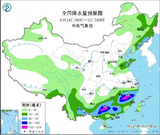 預(yù)計(jì),6月14日08時(shí)至15日08時(shí),江西中東部、浙江南部、福建西部和北部、湖南南部、云南東南部、廣西中北部、廣東中北部以及吉林東部、遼寧東北部、山東南部等地部分地區(qū)有大到暴雨,其中,江西東部、福建西北部、廣西東北部等地部分地區(qū)有大暴雨(100~200毫米)。上述部分地區(qū)伴有短時(shí)強(qiáng)降水(最大小時(shí)降雨量30~50毫米,局地可超過80毫米),局地有雷暴大風(fēng)或冰雹等強(qiáng)對(duì)流天氣。中央氣象臺(tái)6月14日06時(shí)發(fā)布暴雨黃色預(yù)警(見圖1)。