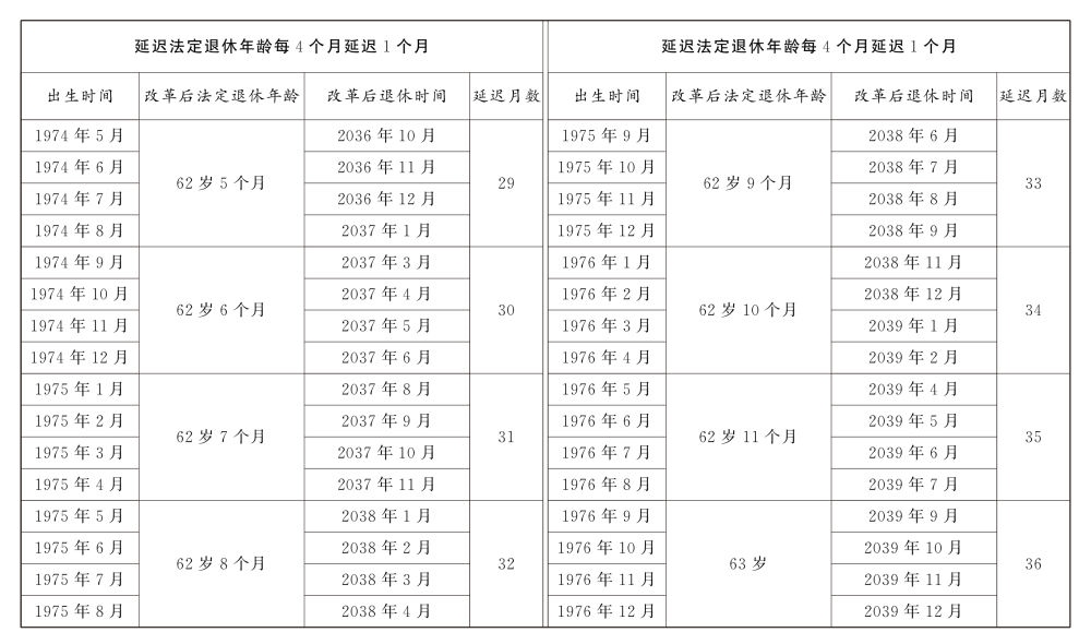 第一條 從2025年1月1日起,男職工和原法定退休年齡為五十五周歲的女職工,法定退休年齡每四個月延遲一個月,分別逐步延遲至六十三周歲和五十八周歲;原法定退休年齡為五十周歲的女職工,法定退休年齡每二個月延遲一個月,逐步延遲至五十五周歲。國家另有規(guī)定的,從其規(guī)定。