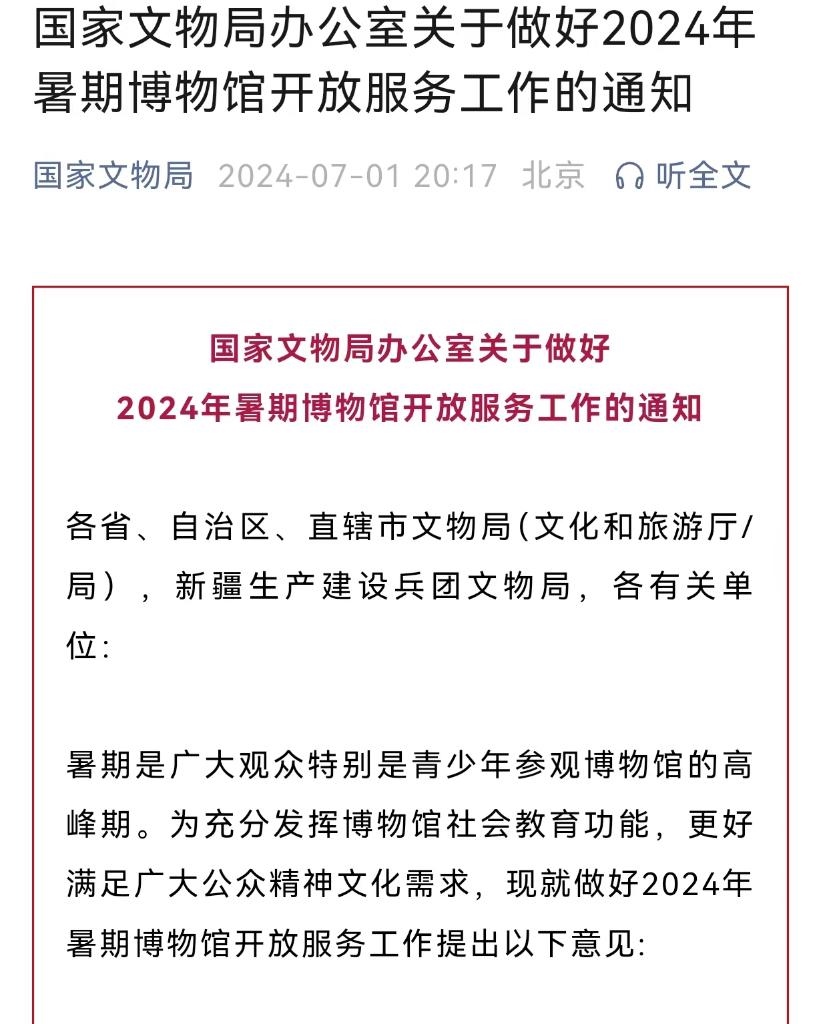 國(guó)家文物局7月1日發(fā)出通知,就做好2024年暑期博物館開(kāi)放服務(wù)工作進(jìn)行部署。通知明確,各級(jí)文物行政主管部門要加強(qiáng)指導(dǎo),科學(xué)評(píng)估場(chǎng)館承載量,創(chuàng)新舉措,通過(guò)多種方式提高觀眾參觀博物館便利化水平。