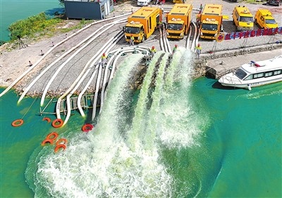 在浙江省臺州市防汛防臺綜合應(yīng)急演練中,市政強排車進行作業(yè)。孫金標攝(人民圖片)