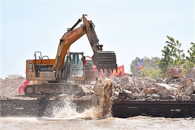 在湖南省岳陽市華容縣團洲垸洞庭湖大堤決口現(xiàn)場,搶險隊伍在進行堵口作業(yè)。新華社記者 陳振海攝
