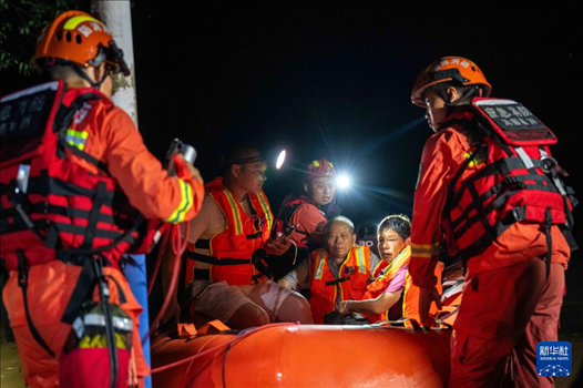凌晨2時許,記者在決口現(xiàn)場看到,由于道路狹窄,通行不便,消防隊員扛著救生艇向受災區(qū)域挺進,不斷有受災群眾乘坐救生艇被轉移至安全地帶。