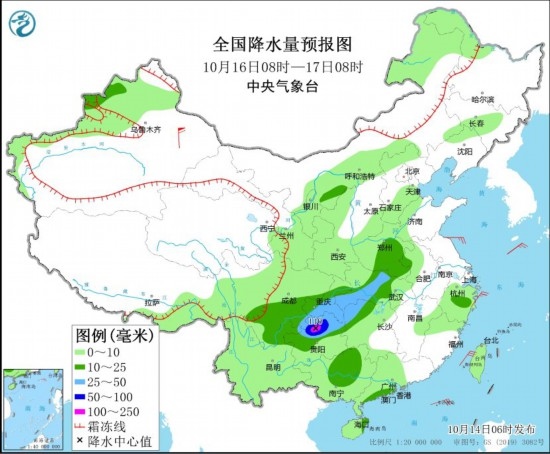 10月16日8時至17日8時,四川東南部、重慶中南部、貴州中北部、湖南西北部、湖北西南部和中部等地部分地區(qū)有中到大雨,其中,四川東南部、貴州北部等地局部地區(qū)有暴雨或大暴雨(100~110毫米)。內(nèi)蒙古東北部、黑龍江西北部、新疆西部、青海南部、西藏東部、四川西部等地有小到中雪,局地大雪或暴雪。