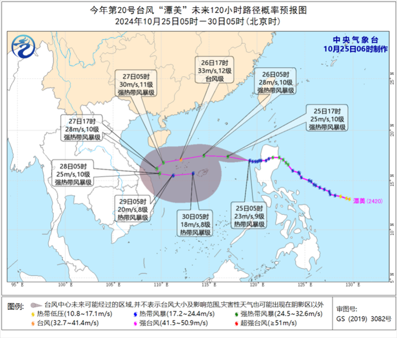 人民網(wǎng)北京10月25日電 (溫璐、高清揚(yáng))據(jù)中央氣象臺(tái)消息,昨日,受“潭美”和冷空氣共同影響,臺(tái)灣島西部和南部、福建沿海、浙江沿海、廣東中部沿海等地出現(xiàn)8~10級(jí)陣風(fēng),局地11~12級(jí)。臺(tái)灣島東部和北部出現(xiàn)暴雨或大暴雨,臺(tái)北市、基隆市和宜蘭縣局地特大暴雨。預(yù)計(jì)今年第20號(hào)臺(tái)風(fēng)“潭美”即將移入南海東部海面,強(qiáng)度緩慢增強(qiáng),最強(qiáng)可達(dá)強(qiáng)熱帶風(fēng)暴級(jí)或臺(tái)風(fēng)級(jí)(28-33米/秒,10-12級(jí)),10月27日夜間開(kāi)始逐漸轉(zhuǎn)向偏東方向移動(dòng),強(qiáng)度逐漸減弱。