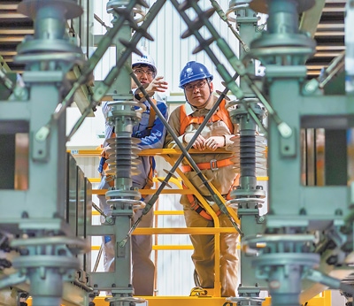 國網(wǎng)南京供電公司員工與南瑞集團(tuán)工作人員在變電站查看設(shè)備狀態(tài)。杜 懿攝