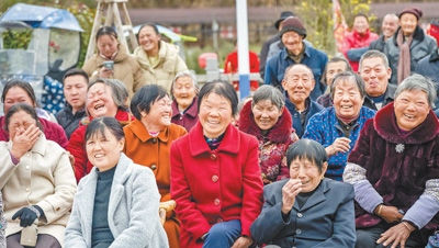 湖北省黃岡市英山縣楊柳灣鎮(zhèn)翻身灣村,觀看采茶戲的村民喜笑顏開。英山采茶戲是湖北極具特色的地方劇種,被列入湖北省第二批省級(jí)非物質(zhì)文化遺產(chǎn)名錄。王 江攝(人民視覺)