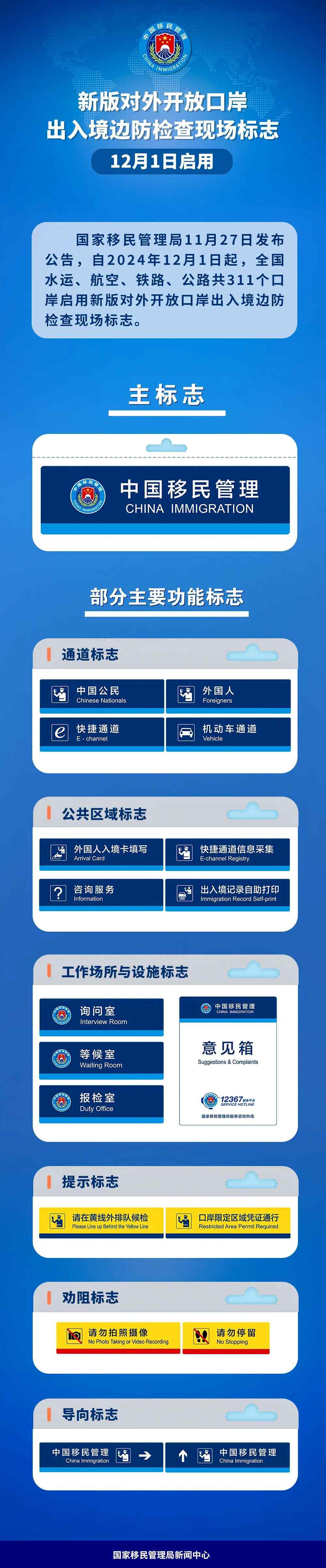 人民網(wǎng)北京11月27日電 (記者梁秋坪、郝萍)國(guó)家移民管理局11月27日發(fā)布公告,自2024年12月1 日起,全國(guó)水運(yùn)、航空、鐵路、公路共311個(gè)口岸啟用新版對(duì)外開(kāi)放口岸出入境邊防檢查現(xiàn)場(chǎng)標(biāo)志。