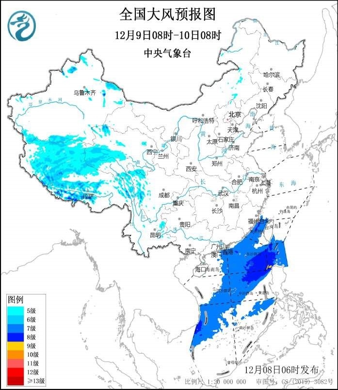 預(yù)計,12月8日08時至9日08時,西藏中西部、青海西南部、川西高原、新疆北部等地部分地區(qū)將有5~6級風(fēng),西藏中西部和青海西南部局地風(fēng)力可達(dá)7~8級;東海大部、臺灣海峽、臺灣以東洋面、巴士海峽、南海北部、中部和西南部海域、北部灣將有7~8級、陣風(fēng)9級的大風(fēng),其中臺灣海峽部分海域的風(fēng)力可達(dá)9級、陣風(fēng)10級。