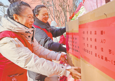 山東省青州市,工作人員將走訪慰問(wèn)困難群眾的愛(ài)心年貨裝車。