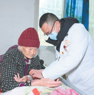 四川省眉山市丹棱縣仁美鎮(zhèn)雄義村,村醫(yī)徐遠(yuǎn)利(右)為92歲的張玉珍測(cè)量血壓。