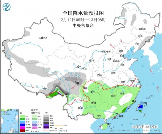 全國降水量預(yù)報圖(2月12日08時-13日08時) 圖片來源:中央氣象臺網(wǎng)站