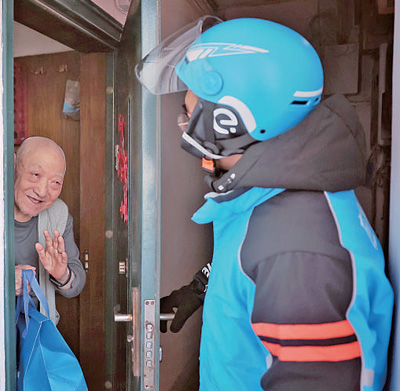 10點(diǎn)35分,兩份餐食放進(jìn)電動(dòng)車保溫箱后,騎手立即出發(fā)。第一單先送離食堂近些的趙老先生,不一會(huì)兒就到了?!澳?,您的餐到了?!瘪R志鵬邊敲門邊說(shuō)道。趙老先生開(kāi)門接過(guò)飯菜后表示感謝:“你們辛苦啊,天天送飯,小伙子真棒!”