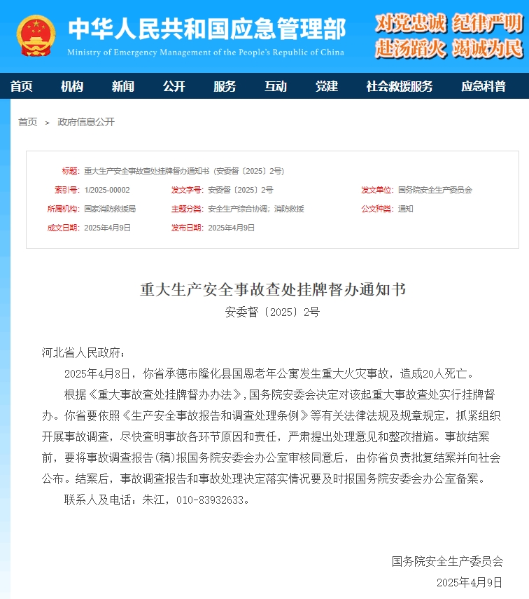 人民網(wǎng)北京4月9日電 (記者溫璐、郝萍)據(jù)應(yīng)急管理部消息,4月9日,國務(wù)院安全生產(chǎn)委員會發(fā)布向河北省人民政府發(fā)布重大生產(chǎn)安全事故查處掛牌督辦通知書。通知書稱,2025年4月8日,河北省承德市隆化縣國恩老年公寓發(fā)生重大火災(zāi)事故,造成20人死亡。根據(jù)《重大事故查處掛牌督辦辦法》,國務(wù)院安委會決定對該起重大事故查處實行掛牌督辦。河北省要依照《生產(chǎn)安全事故報告和調(diào)查處理條例》等有關(guān)法律法規(guī)及規(guī)章規(guī)定,抓緊組織開展事故調(diào)查,盡快查明事故各環(huán)節(jié)原因和責任,嚴肅提出處理意見和整改措施。事故結(jié)案前,要將事故調(diào)查報告(稿)報國務(wù)院安委會辦公室審核同意后,由河北省負責批復(fù)結(jié)案并向社會公布。結(jié)案后,事故調(diào)查報告和事故處理決定落實情況要及時報國務(wù)院安委會辦公室備案。