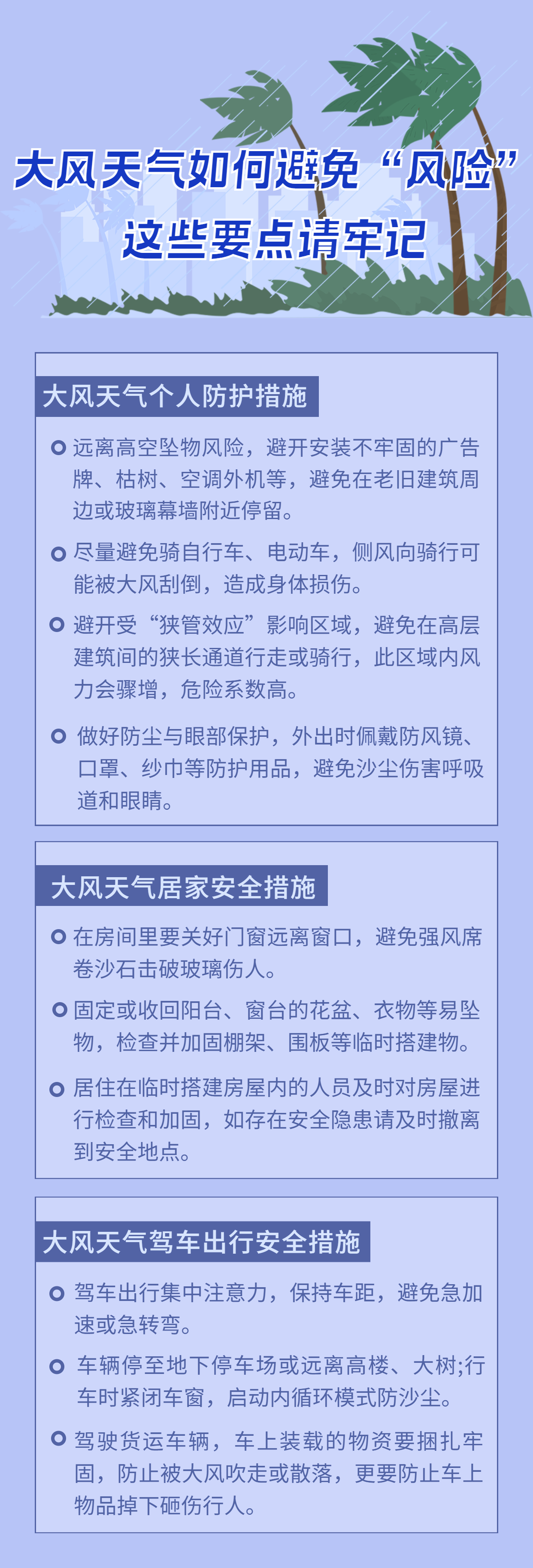 據(jù)氣象部門預(yù)報(bào),未來幾日,全國(guó)多地將出現(xiàn)強(qiáng)風(fēng)天氣,部分地區(qū)陣風(fēng)風(fēng)力可達(dá)12~13級(jí)。春季到來,大風(fēng)天氣增多,給我們的生活帶來了諸多安全隱患。該如何做好防范?一起來了解。