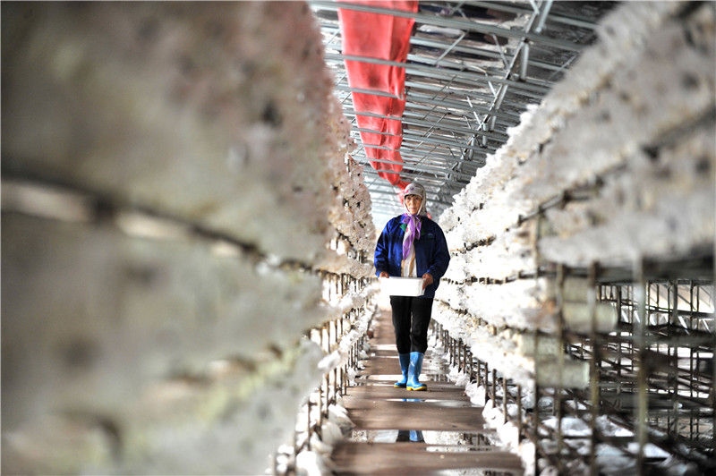 寧夏銀川市永寧縣閩寧鎮(zhèn)原隆村村民在光伏溫棚內(nèi)查看食用菌生長情況(2018年8月17日攝)。新華社記者劉軍喜攝