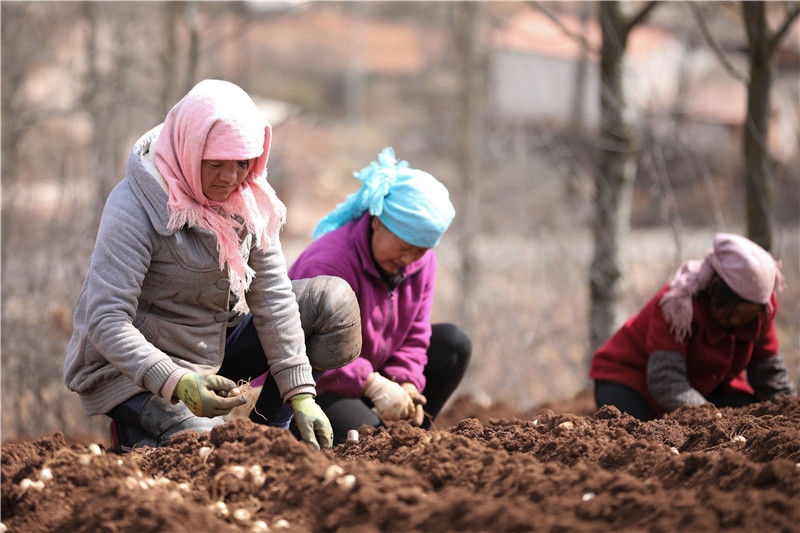3月11日,甘肅省定西市渭源縣元古堆村村民在種植百合。新華社發(fā)(馬希平攝)
