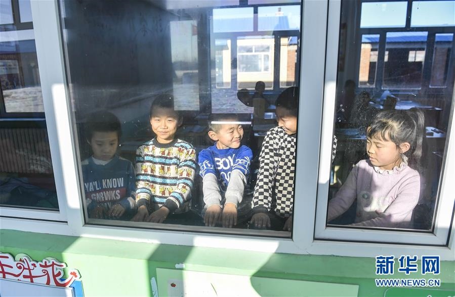 吉林省德惠市邊崗鄉(xiāng)臥虎村小學(xué)學(xué)生在戶外活動(dòng)后圍著教室內(nèi)的環(huán)流散熱器取暖(2018年12月26日攝)。新華社記者許暢攝