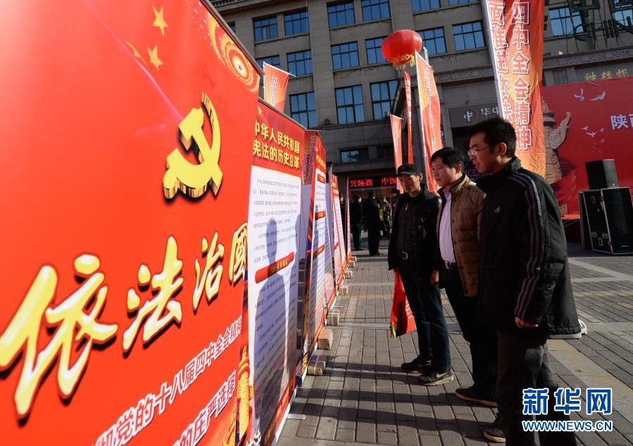 西安市民在國家憲法日宣傳活動(dòng)現(xiàn)場觀看依法治國宣傳展板(2014年12月4日攝)。新華社記者李一博攝