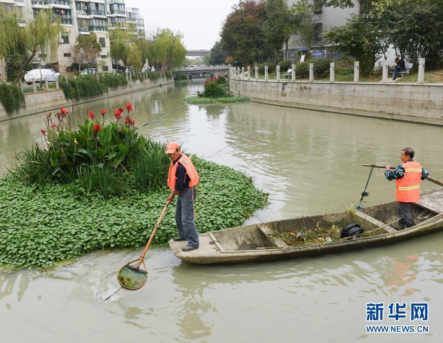 11月16日,工作人員在浙江湖州吳興區(qū)環(huán)渚街道藤橋港河道里清除雜物。新華社記者 翁忻旸 攝