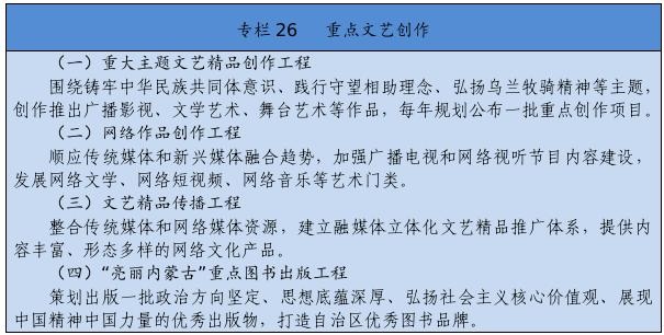 堅持以人民為中心的創(chuàng)作導(dǎo)向,創(chuàng)作生產(chǎn)出人民喜聞樂見的優(yōu)秀作品。繁榮發(fā)展新聞出版、廣播影視、文學(xué)藝術(shù),實施文藝作品質(zhì)量提升工程,加強優(yōu)秀劇本孵化和生活采風(fēng)。推動重大主題文藝精品創(chuàng)作,加強現(xiàn)實題材創(chuàng)作生產(chǎn)。改進重點作品創(chuàng)作引導(dǎo)機制,建立重點文化藝術(shù)項目滾動扶持機制。設(shè)立內(nèi)蒙古文化藝術(shù)發(fā)展專項資金。加強文化文藝場館建設(shè)。制定文藝人才發(fā)展規(guī)劃,開展內(nèi)蒙古電影新導(dǎo)演計劃。實施文化潤心工程,以文藝創(chuàng)作鑄牢中華民族共同體意識。提升廣播電視和網(wǎng)絡(luò)視聽產(chǎn)品質(zhì)量,豐富網(wǎng)絡(luò)文藝內(nèi)容。搭建文藝精品遴選、展示、推出平臺,建設(shè)內(nèi)蒙古音樂廳,支持因地制宜建設(shè)綜合劇場、音樂廳和美術(shù)館,舉辦內(nèi)蒙古藝術(shù)節(jié)、內(nèi)蒙古音樂節(jié)等活動,大力實施文藝惠民演出和地方戲傳承創(chuàng)新工程,定期舉辦全區(qū)地方戲優(yōu)秀劇目展演以及音樂、舞蹈、小戲小品專業(yè)賽事,打造獨具特色的文化藝術(shù)品牌。
