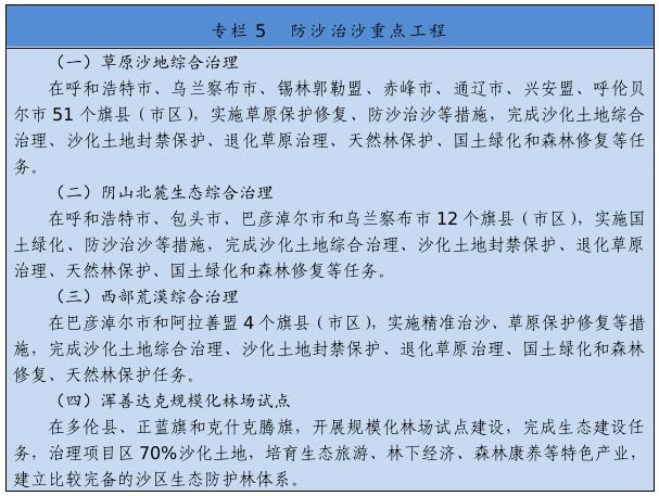 繼續(xù)實施京津風(fēng)沙源治理等重點工程,推廣庫布其沙漠治理方式和沙產(chǎn)業(yè)模式,推動渾善達克、烏珠穆沁、呼倫貝爾沙地治理。推進規(guī)模化林場建設(shè),采取人工造林、封沙育林、飛播造林等方式恢復(fù)植被。建設(shè)荒漠綠洲防護林、防風(fēng)固沙林、沙漠鎖邊林、農(nóng)田草牧場防護林以及水土保持林。以干旱半干旱草原為重點,加強草場改良和人工種草,實行圍封禁牧、劃區(qū)輪牧、季節(jié)性休牧、舍飼圈養(yǎng)等措施,保護和恢復(fù)草原植被。以內(nèi)蒙古高原等為重點,推進防護林體系建設(shè)及退化林修復(fù)、退化草原修復(fù)、京津風(fēng)沙源治理。新增水土流失綜合治理3.33萬平方公里。