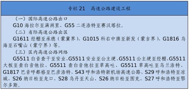 基礎(chǔ)設(shè)施保障更加有力。交通運輸、能源外送通道和引調(diào)水骨干工程接續(xù)落地。綜合交通運輸體系基本形成,接入全國高鐵網(wǎng),呼和浩特至張家口高速鐵路,通遼、赤峰至京沈高速鐵路連接線,浩勒報吉至吉安鐵路順利建成,建成高速鐵路404公里。全區(qū)103個旗縣(市區(qū))全部通高等級公路,京新高速臨河至哈密、丹錫高速錫林浩特至巴林右旗等高速公路通車運營,所有鄉(xiāng)鎮(zhèn)(蘇木)和具備條件的建制村通硬化路,建成“四好農(nóng)村路”6.6萬公里,綜合交通網(wǎng)總里程達到22.5萬公里。呼和浩特新機場開工建設(shè),呼倫貝爾、包頭、通遼等機場完成改擴建。新建通用機場15個,民用機場達到40個。黃河內(nèi)蒙古段二期防洪、引綽濟遼、東臺子水庫等重大水利工程建設(shè)順利推進。全區(qū)5G基站突破1萬個。建成5條特高壓外送電通道。克什克騰至北京煤制氣管道投入運營。呼和浩特地鐵1、2號線一期工程建成運營。