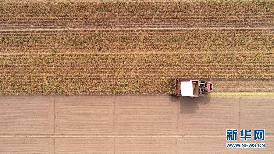 在河北省石家莊市藁城區(qū)梅花鎮(zhèn)朱家莊村的大豆田地里,農(nóng)戶駕駛農(nóng)機(jī)收割大豆(2020年10月10日攝,無(wú)人機(jī)照片)。新華社發(fā)(梁子棟 攝)