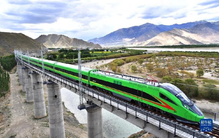 這是試運(yùn)行的復(fù)興號列車行駛在西藏山南市境內(nèi)(6月16日攝)。6月25日,全長435公里、設(shè)計(jì)時速160公里的拉林鐵路建成通車,西藏首條電氣化鐵路建成,同時復(fù)興號實(shí)現(xiàn)對31個省區(qū)市全覆蓋。新華社記者