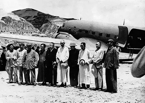 1945年7月,國民參政會參政員黃炎培等六人飛抵延安,同中國共產(chǎn)黨商談兩黨團結、共建國內(nèi)和平問題,毛澤東等親臨機場歡迎。圖:新華社