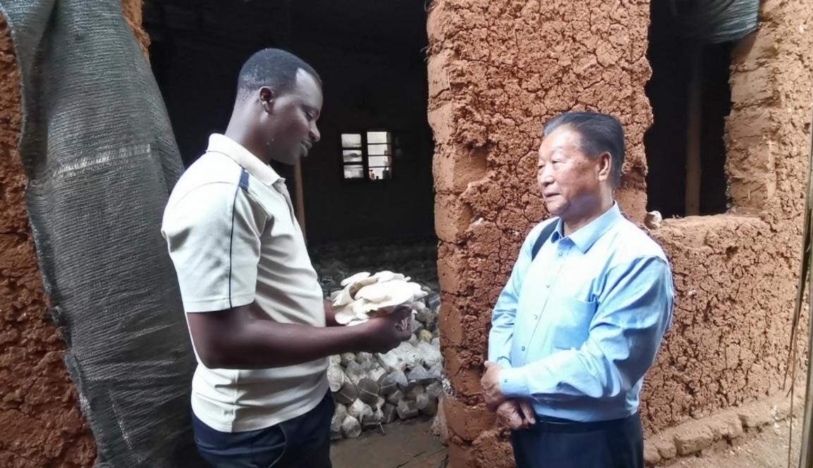 2019年,林占熺在盧旺達指導當?shù)剞r(nóng)戶菌草種菇。圖片來源:國家菌草工程技術(shù)研究中心