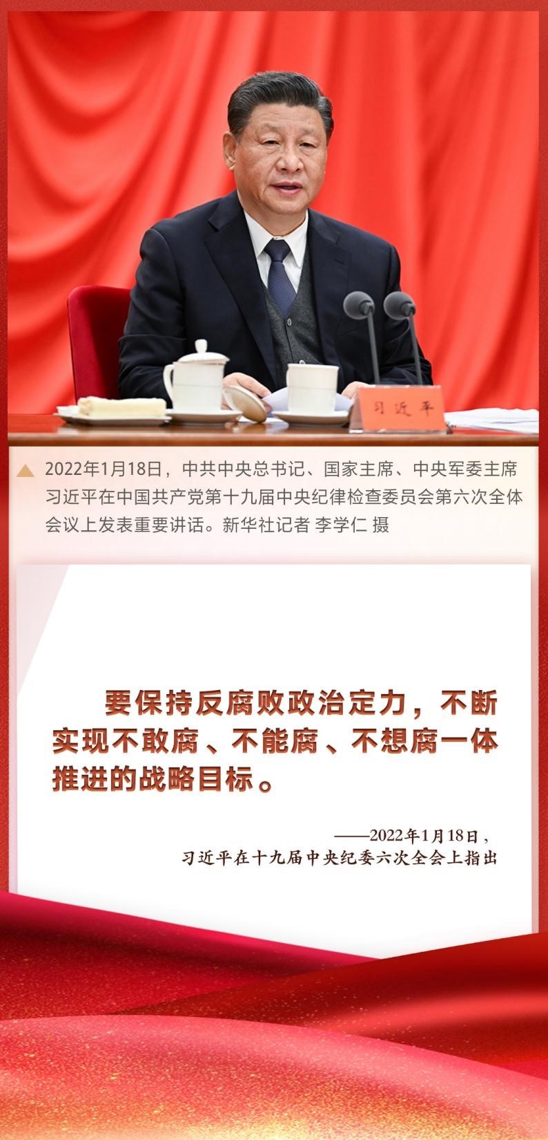 “要保持反腐敗政治定力,不斷實(shí)現(xiàn)不敢腐、不能腐、不想腐一體推進(jìn)的戰(zhàn)略目標(biāo)?!敝泄仓醒肟倳?、國家主席、中央軍委主席習(xí)近平在十九屆中央紀(jì)委六次全會上發(fā)表重要講話,深刻總結(jié)新時代黨的自我革命的成功實(shí)踐,深刻闡述全面從嚴(yán)治黨取得的歷史性、開創(chuàng)性成就,產(chǎn)生的全方位、深層次影響,對堅(jiān)持不懈把全面從嚴(yán)治黨向縱深推進(jìn)、迎接黨的二十大勝利召開作出戰(zhàn)略部署。