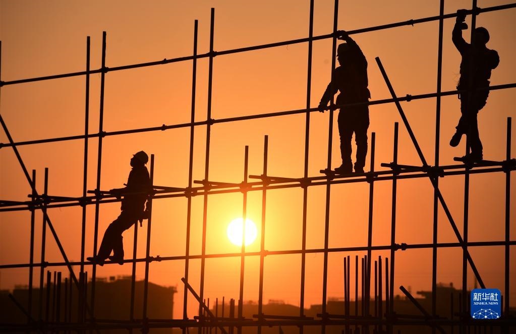 2022年1月1日,在河北雄安新區(qū)容西安置房項(xiàng)目D標(biāo)段施工現(xiàn)場(chǎng),中鐵上海工程局工人在新年第一縷陽光的照耀下工作。新華社發(fā)(傅新春 攝)