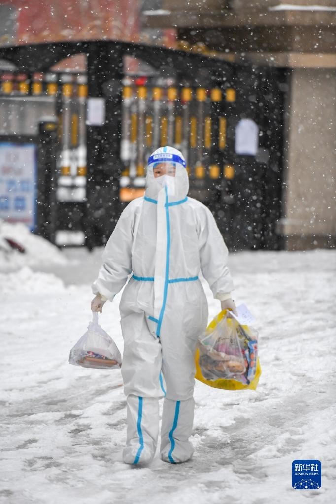 3月15日,吉林省吉林市昌邑區(qū)興華街道中興社區(qū)網(wǎng)格員宋冉為隔離居民運送生活物資。新華社記者 張楠 攝