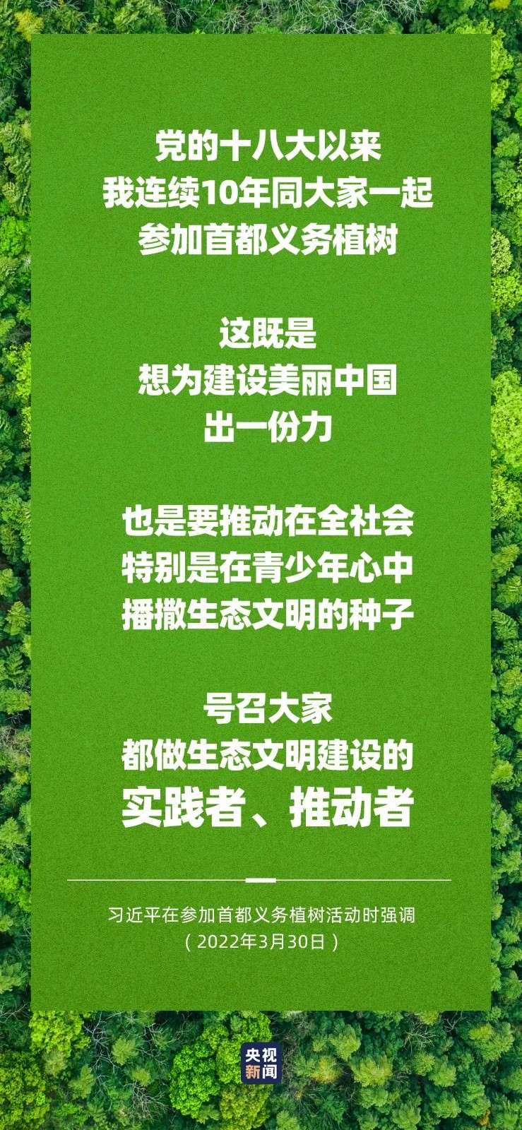 中共中央總書記、國家主席、中央軍委主席習(xí)近平3月30日在參加首都義務(wù)植樹活動時強(qiáng)調(diào),黨的十八大以來,我連續(xù)10年同大家一起參加首都義務(wù)植樹,這既是想為建設(shè)美麗中國出一份力,也是要推動在全社會特別是在青少年心中播撒生態(tài)文明的種子,號召大家都做生態(tài)文明建設(shè)的實(shí)踐者、推動者,持之以恒,久久為功,讓我們的祖國天更藍(lán)、山更綠、水更清、生態(tài)環(huán)境更美好。