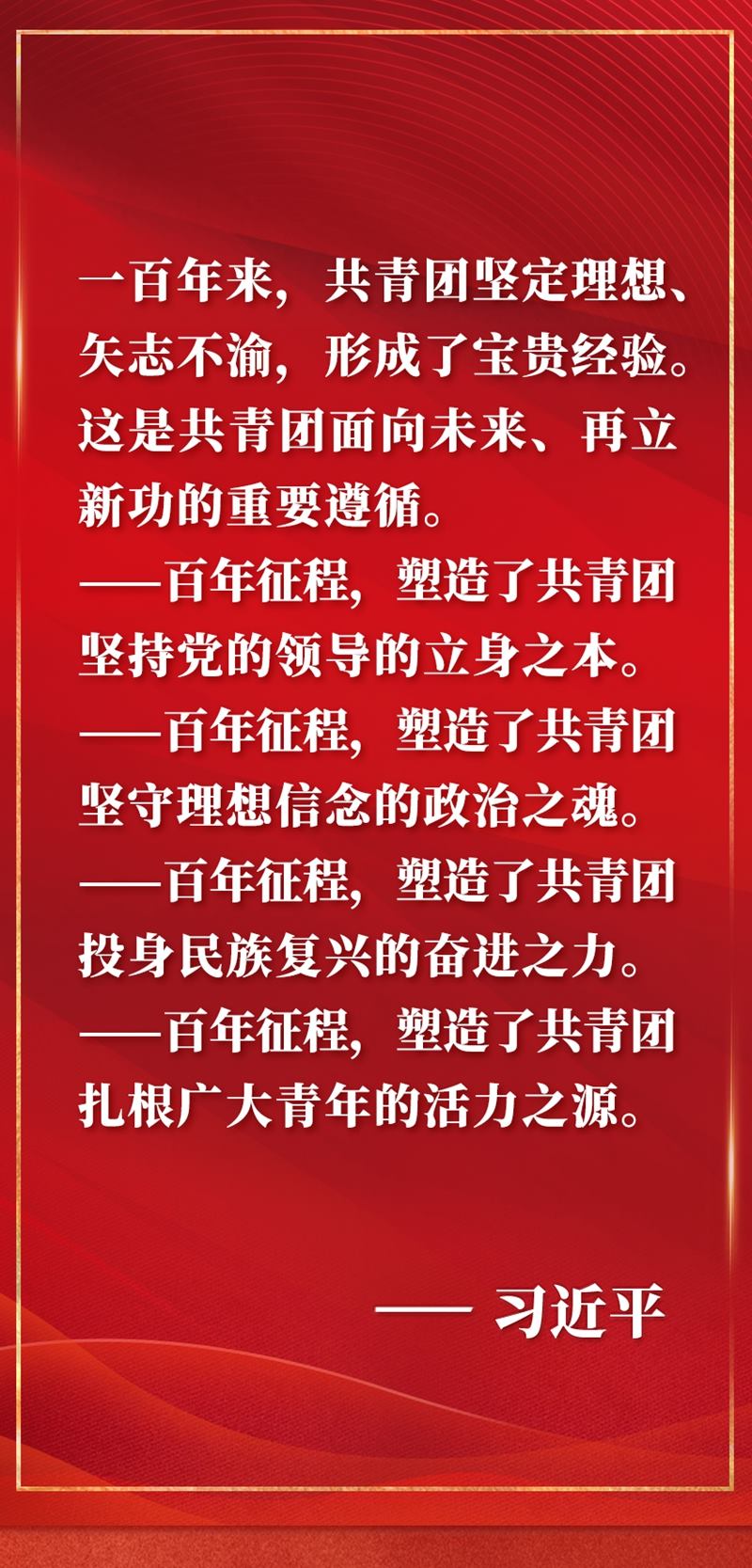 慶祝中國共產(chǎn)主義青年團(tuán)成立100周年大會10日上午在北京人民大會堂隆重舉行。中共中央總書記、國家主席、中央軍委主席習(xí)近平在會上發(fā)表重要講話,全面回顧百年來共青團(tuán)堅定不移聽黨話、跟黨走的奮斗歷程,深刻闡明共青團(tuán)和青年工作的寶貴經(jīng)驗,對當(dāng)代青年寄予殷切期望,對做好新時代共青團(tuán)工作提出明確要求。