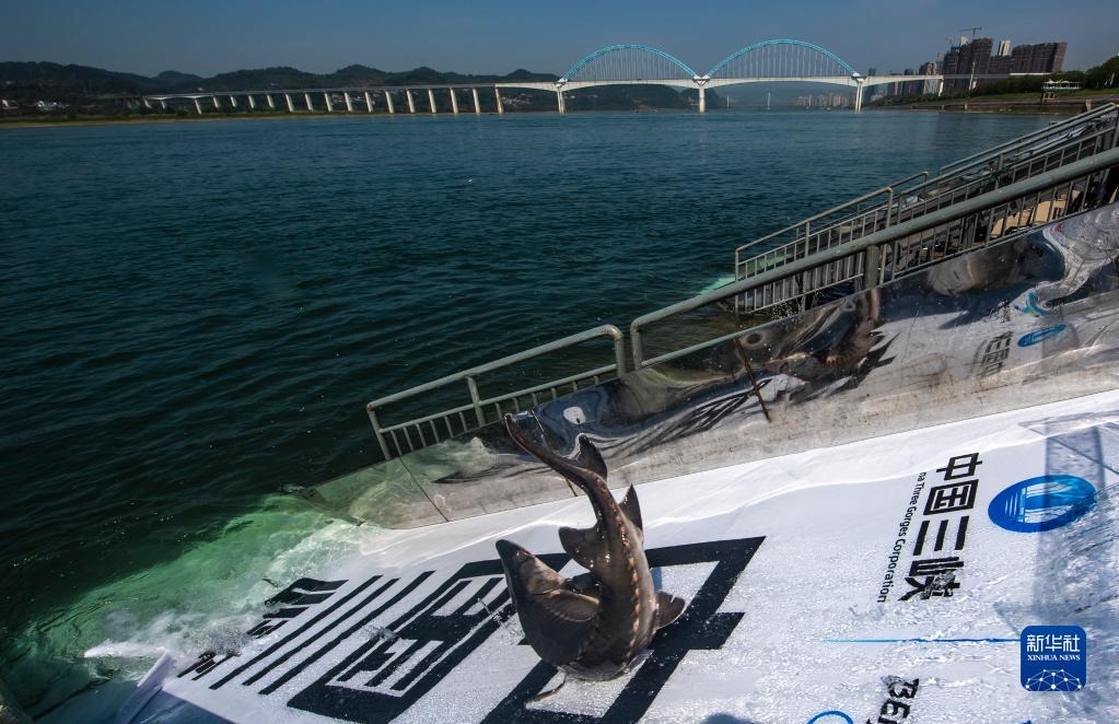 在湖北省宜昌市舉行的“2022年長(zhǎng)江三峽中華鱘放流活動(dòng)”現(xiàn)場(chǎng),中華鱘從放流通道滑入長(zhǎng)江(4月9日攝)。新華社發(fā)(鄭家裕 攝)