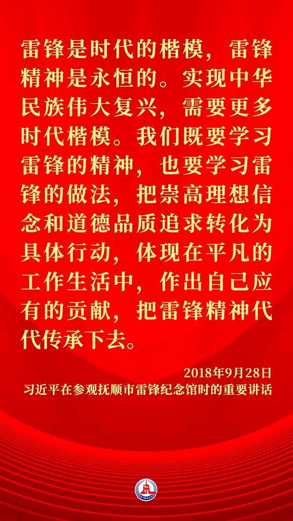 “雷鋒是時(shí)代的楷模,雷鋒精神是永恒的。實(shí)現(xiàn)中華民族偉大復(fù)興,需要更多時(shí)代楷模?!绷?xí)近平總書記的號(hào)召,喚起億萬人奮斗與堅(jiān)守。新時(shí)代,雷鋒精神是持續(xù)激發(fā)崇德向善的磅礴偉力;新時(shí)代“雷鋒”,在新征程上頑強(qiáng)拼搏,匯聚起共和國奔騰向前的時(shí)代潮流!