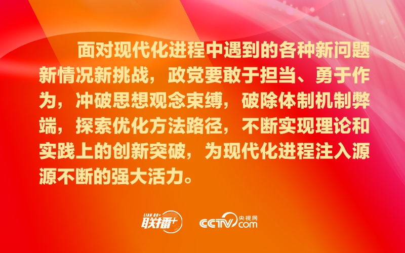 政黨要把自身建設(shè)和國家現(xiàn)代化建設(shè)緊密結(jié)合起來,踔厲奮發(fā),勇毅篤行,超越自我,確保始終有信心、有意志、有能力應(yīng)對(duì)好時(shí)代挑戰(zhàn)、回答好時(shí)代命題、呼應(yīng)好人民期盼,為不斷推進(jìn)現(xiàn)代化進(jìn)程引領(lǐng)方向、凝聚力量。