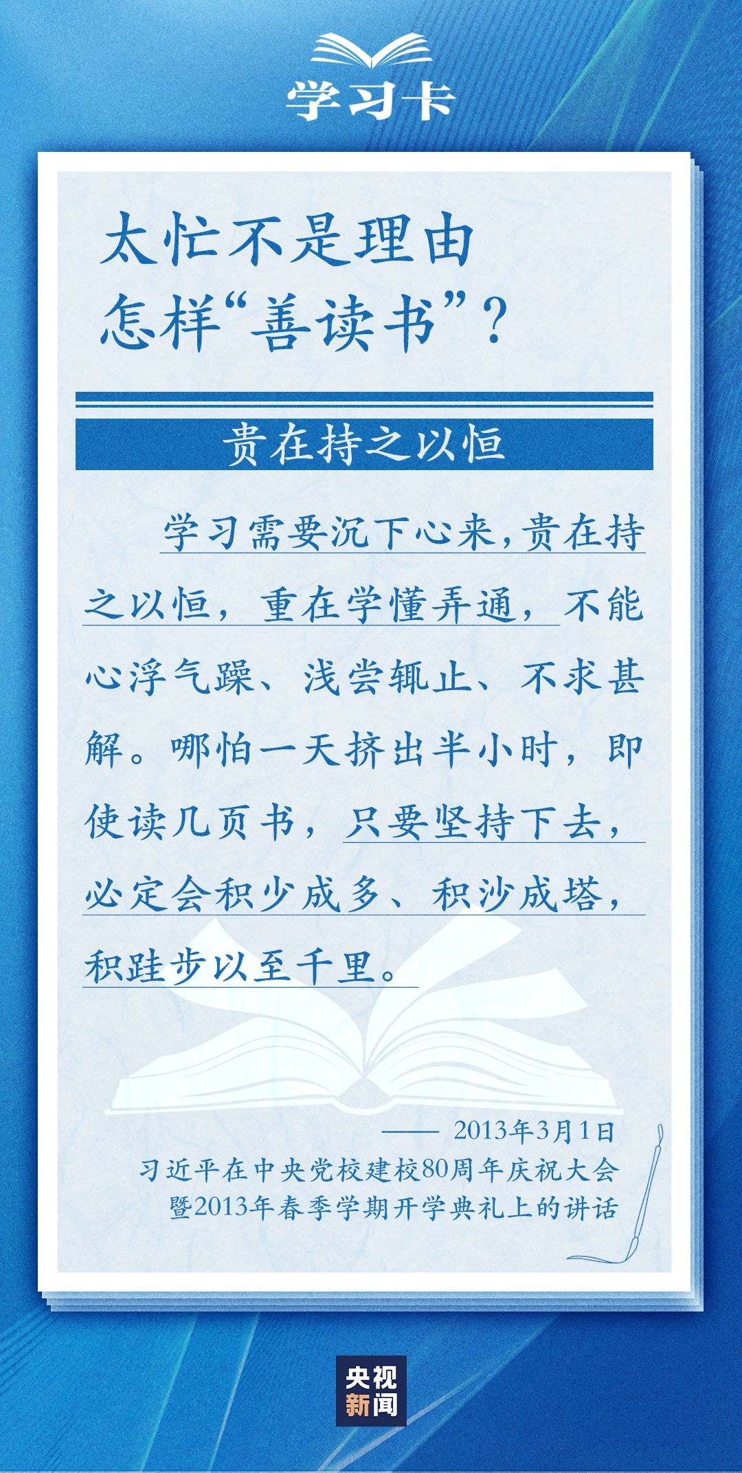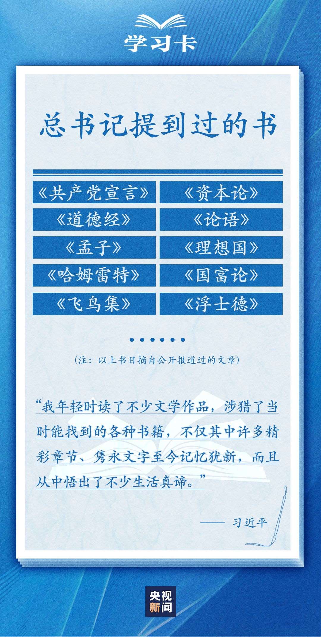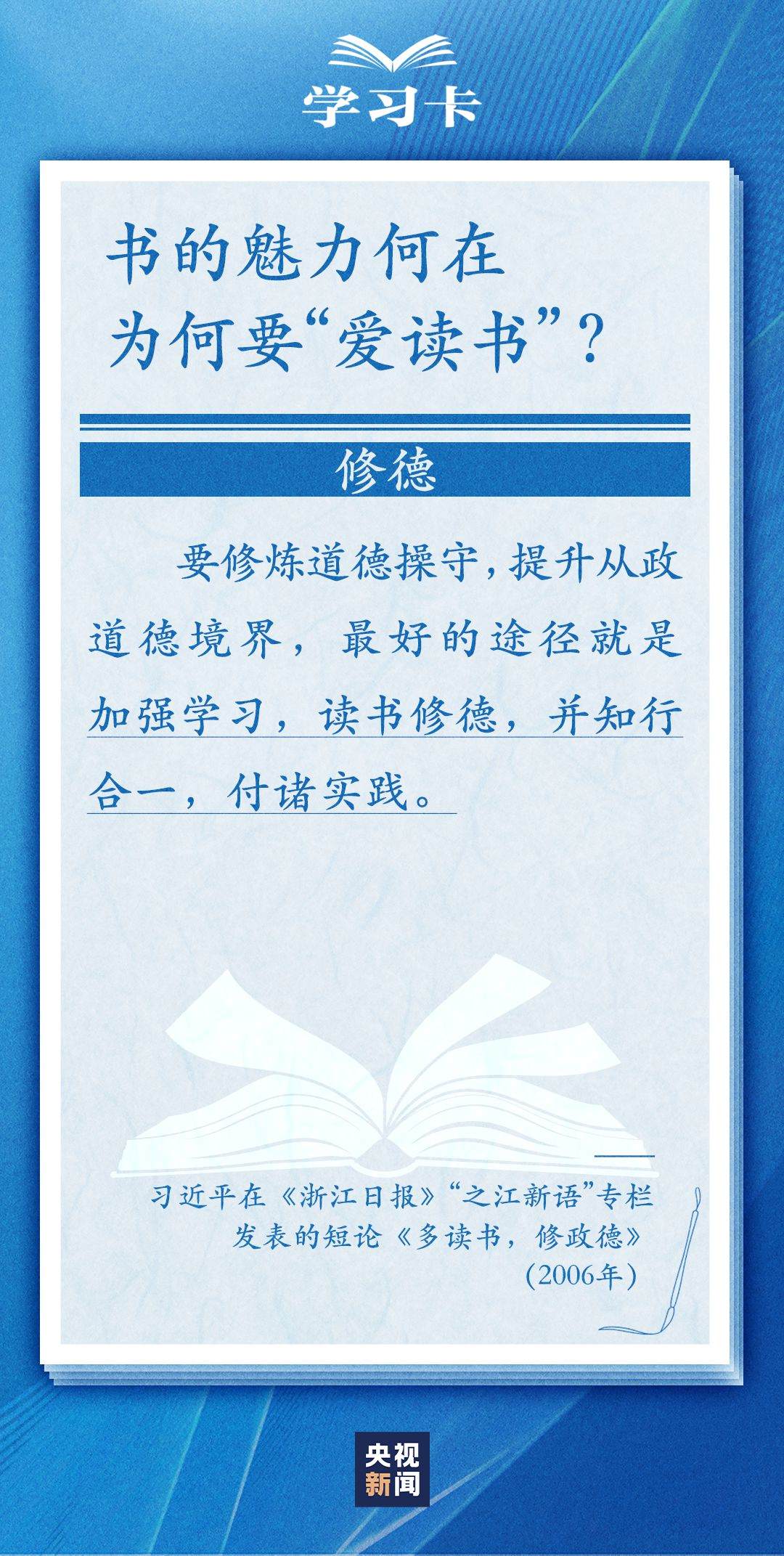 今天(4月23日)是世界讀書(shū)日。習(xí)近平曾多次講述和書(shū)籍的不解之緣,分享讀書(shū)學(xué)習(xí)的感悟,倡導(dǎo)“愛(ài)讀書(shū)、讀好書(shū)、善讀書(shū)”。書(shū)的魅力何在,為何要“愛(ài)讀書(shū)”?如何能“選好書(shū)”?怎樣“善讀書(shū)”?一起學(xué)習(xí)↓
