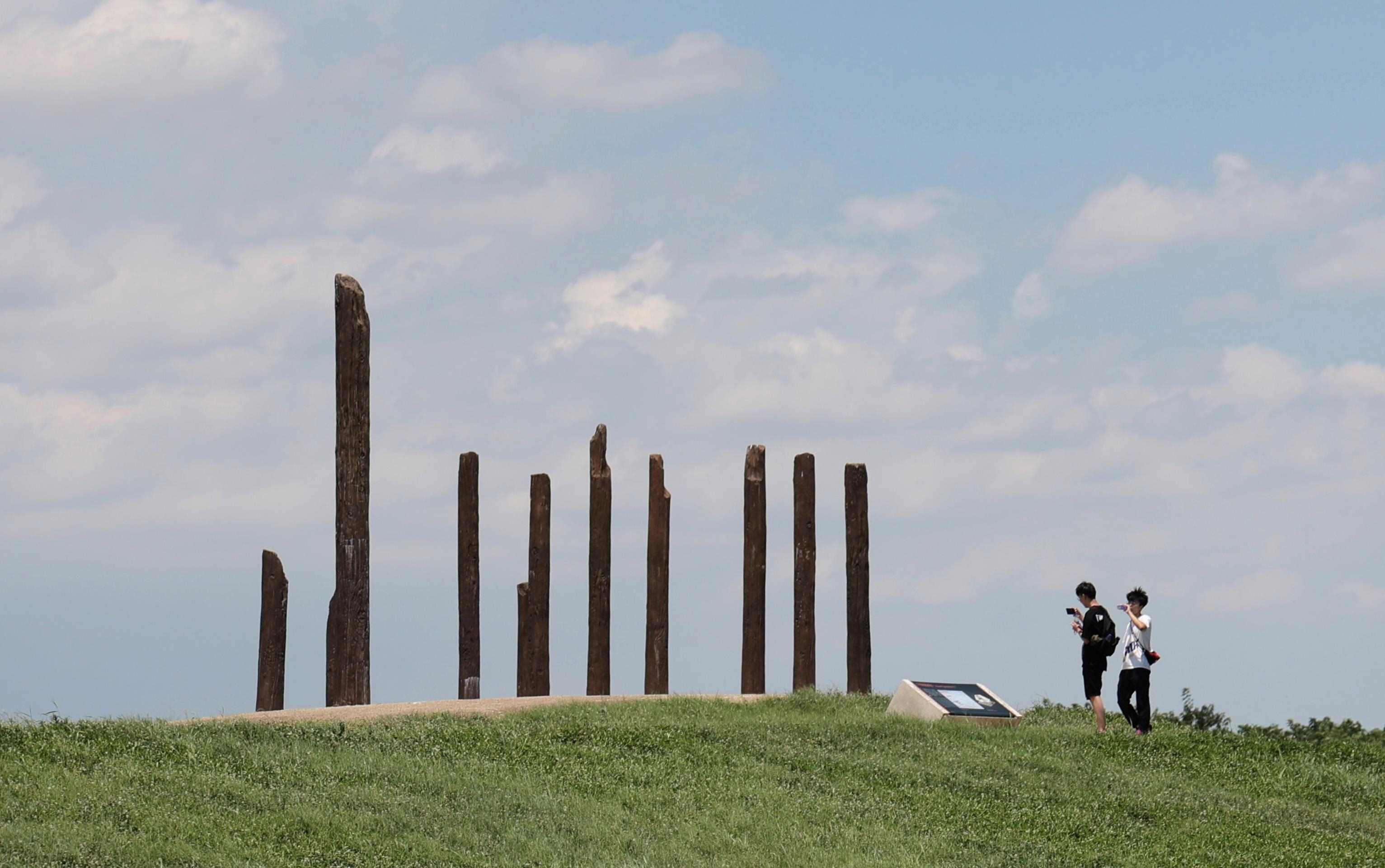 △游客在良渚古城遺址公園參觀莫角山遺址。